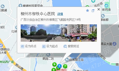 柳州站1.1公里向东步行 到 鹅山路东(火车站东广场)1站乘 32路 (公交南环站方向) 到 延安大酒店(汽车南站)350米向北步行 到 柳州市柳铁中心医院,