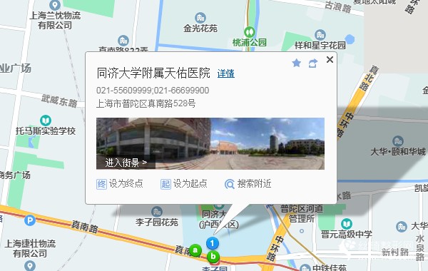 上海站50米向西南步行 到 上海火车站(北广场)10站乘 117路 (桃浦五村方向) 到 交通路真南路260米向西北步行 到 同济大学附属天佑医院