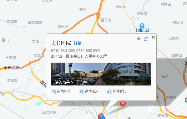 十堰站700米向西北步行 到 公交二公司2站乘 9路 (公交四公司方向) 到 太和医院180米向南步行 到 太和医院