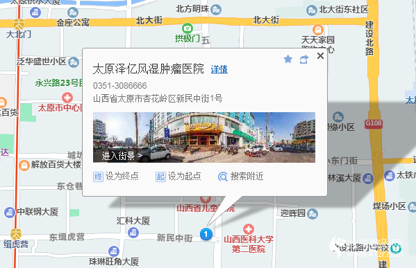 太原站510米向西步行 到 火车站5站乘 820路支线 (翠馨苑方向) 或 820路 到 山大二院190米向西北步行 到 太原泽亿医院