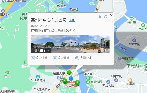 惠州汽车客运站140米向东南步行 到 汽车总站4站乘 369路 (仍图方向) 或 369路B线到 飞鹅岭公园460米向东北步行 到 惠州市中心人民医院