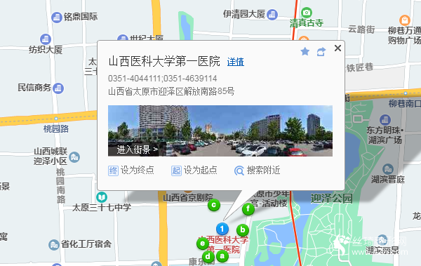 太原汽车客运西站530米向东北步行 到 新西客站11站乘 K809路 (东中环凯旋街口方向) 到 迎泽桥东6米站内换乘 618路3站乘 618路 (火车站方向) 或 1路 859路 618路支线 308路 611路 到 大南门780米向西南步行 到 山西医科大学第一医院
