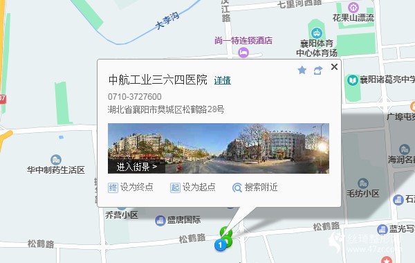 樊城区1公里向西南步行 到 汉江路工业区2站乘 546路 (岘山路华中药业方向) 到 松鹤路中50米向东步行 到 中航工业三六四医院