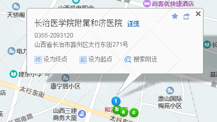 长治站140米向东步行 到 火车站18站乘 2路 (炎帝广场方向) 到 和济医院160米向东步行 到 长治医学院附属和济医院