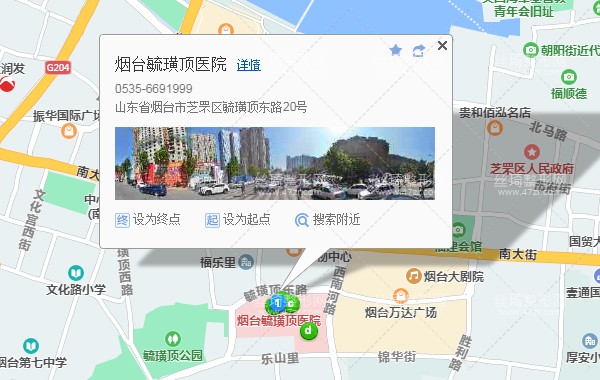 烟台站390米向东南步行 到 火车站北广场2站乘 81路 (城铁南站方向) 或 86路 51路 到 南大街福莱金店330米向西南步行 到 烟台毓璜顶医院,