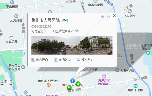 焦作站390米向北步行 到 火车站3站乘 23路 (凤凰小区方向) 或 7路 到 雕塑公园1公里向西北步行 到 焦作市人民医院,
