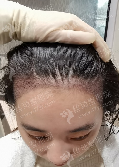 发际线种植中:来到医院见到医生以后,医生就开始对我的额头部位进行了植发区域的设计并做好了标记,然后开始在我的后脑部位提取毛囊将取出来的毛囊交给陪护去做,分离之后一直到植发的区域,整个过程是比较繁琐的,还在利用先进的设备进行操作,所以进行的很顺利,虽然用的时间比较长,但是手术做得特别顺利。
