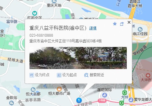 重庆汽车站650米向北步行 到 两路口 5口 进站2站乘 轨道交通1号线 (璧山方向) 到 大坪 1口 出站200米向东步行 到 大坪1站乘 408路 (总部城方向) 到 茶亭北路340米向东步行 到 重庆八益牙科医院(渝中区)