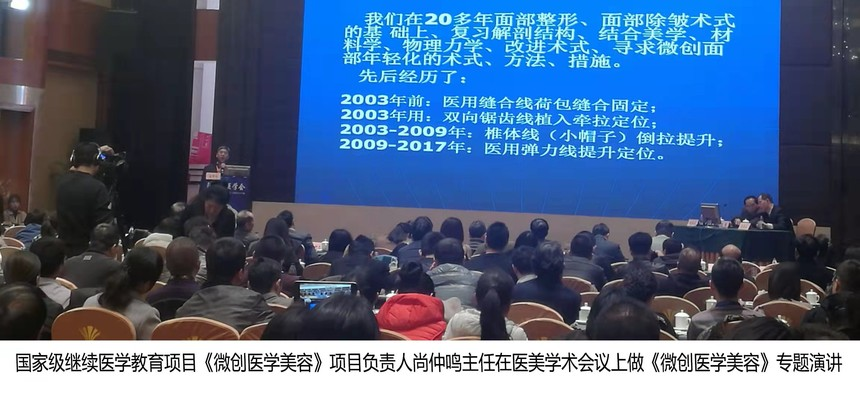 5月9号 尚氏微创面部年轻化提升定位新技术培训:国家级继续医学教育 《微创医学美容》项目负责人尚仲鸣主任深入研究、分析面部软组织松垂移位衰老现象的原因,巧妙材料力学原理应用于面部松垂软组织提升研究推出了医学微创面部年轻化提升定位新技术。通过力学的计算,有效的使松垂下移的软组织恢复到年轻时的状态,且长期保持美容效果。明显效果维持十年,理论上终生有效。无需开刀即可取得提眉、提外眼角、提苹果肌、提松垂的面颊、鼻唇沟变浅、矫正歪嘴、提口角。结合注射美容、脂肪移植、射频精雕使面部年轻化的神话变成现实。求美者提供了一种行之有效,安全可靠,美容效果长久的医疗美容项目。深受求美者欢迎。