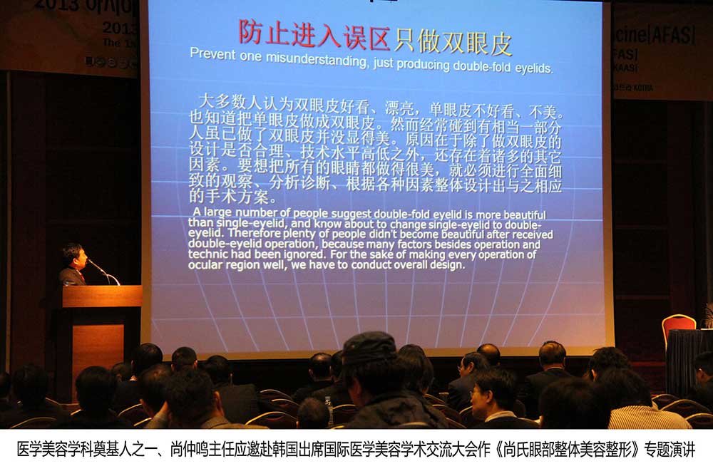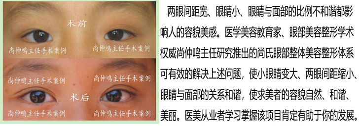 尚仲鸣主任根据眼部美容的民意调查和对眼部美容美学的研究,总结得出中国大陆乃至东南亚人的群体眼部审美趋向是大眼睛漂亮。提出了把小眼睛变成大眼睛是美容整形的方向和任务,约在1982年前后既研究推出了小眼睛放大的项目。其美学要素在于:眼睛在面部的位置、比例、大小非常重要。关系者眼睛与面部和谐与否。用更通俗的话,就是看上去顺眼或不顺眼。顺眼既是美的要素之一。不顺眼显然是不美。