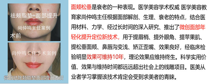 美容医学学科奠基人之一,医学美容教育家、尚仲鸣主任担任国家级继续医学教育项目《微创医学美容》项目负责人。尚仲鸣主任深入研究、分析面部软组织松垂移位衰老现象的原因,巧妙利用材料力学,提出面部软组织松垂提升的三大要素:软组织松垂部位的挂附力,提拉该部位向上的传导力、最上端所必要的铆钉固位力,推出了医学微创面部年轻化提升定位新技术。通过力学的计算,有效的使松垂下移的软组织恢复到年轻时的状态,且长期保持美容效果。明显效果维持十年,理论上终生有效。无需开刀即可取得提眉、提外眼角、提苹果肌、提松垂的面颊、鼻唇沟变浅、矫正歪嘴、提口角。结合注射美容、脂肪移植、射频精雕使面部年轻化的神话变成现实。为求美者提供了一种行之有效,安全可靠,美容效果长久的医疗美容项目。深受求美者欢迎。