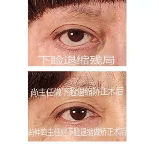 下眼睑退缩呈现 “三白眼、狼眼” 的凶相。多是做袪除眼袋手术失误失败、错误的下睑下置手术、衰老等因素所致。上图是尚仲鸣主任对下眼睑退缩残局做修整术的前后对照。残局修整术难度大、情况复杂、组织缺损、条件受限。且伤残者的心理已很脆弱,经不起折腾。因此从业者没有确切的把握,不要轻易动手。以免给受伤者雪上加霜。